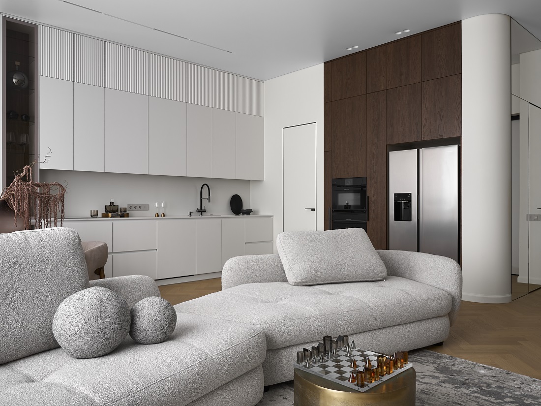 Квартира в ЖК AFI Park Воронцовский в Москве площадью 98 кв.м в минималистичном стиле — это интерьер, где нет ничего лишнего, при этом есть и декор, и детали.